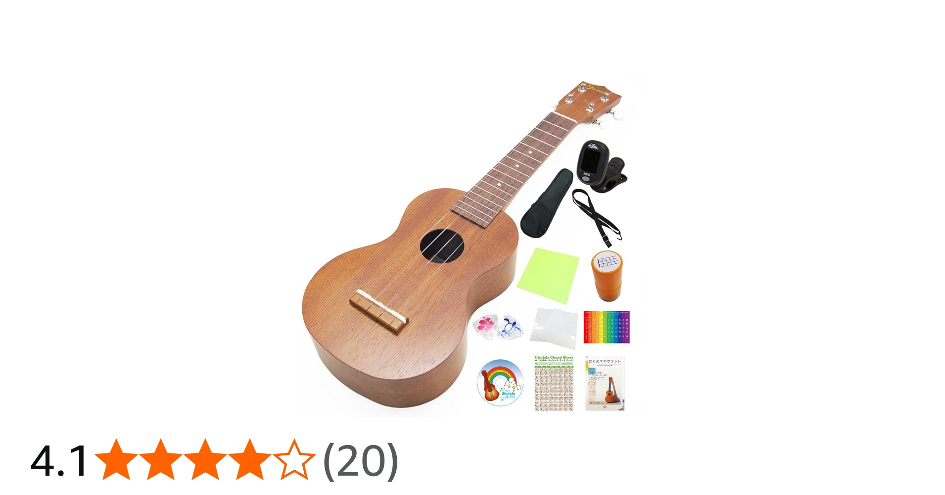 【セット内容】 1. ウクレレ本体 2. ソフトケース 3. クリップチューナー 4. 教則DVD 5. 教則本 6. スクラッチガード 7. コードシート 8. ポジションステッカー 9. コードスタンプ 10. ストラップ 11. クリ...