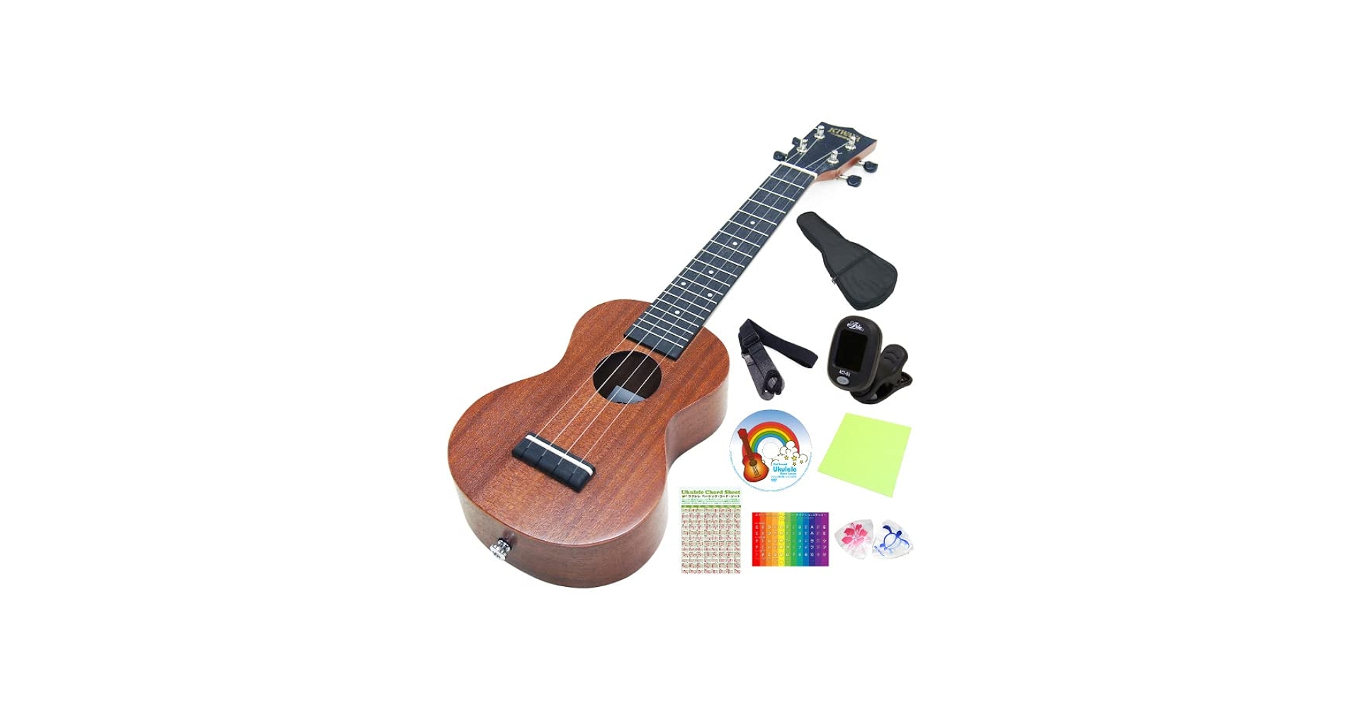 購入前には必ず「サイズ表記」「ボディ材」「ペグの種類」「付属品の有無(チューナー、替え弦、ケース、教則)」を確認してください。